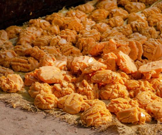 After traditional processing, the jaggery is naturally prepared and cooled without any chemicals or additives. This natural preparation helps retain purity, natural sweetness, and quality, ensuring a safe and wholesome product ready for everyday use.